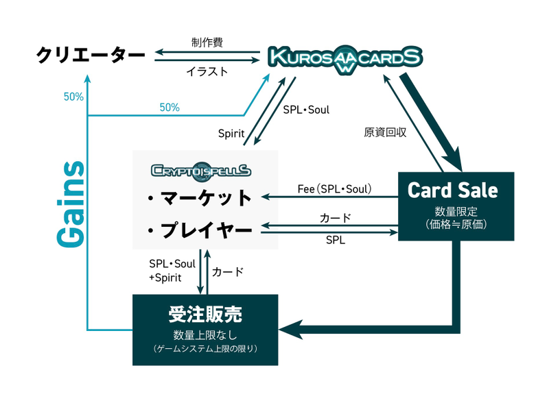上の図ではパッと見プレイヤーは単なる消費者にも見えますが、作品が手に入るのは勿論、その作品を愛でるだけでなく大会でカードとして使って稼ぐもよし、spiritの供給者となって稼ぐもよしです。